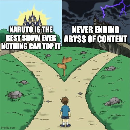 I feel like it’s this for most people. Either you understand Naruto is a good show but don’t necessarily feel the need to watch anything else, or you get too curious for your own good, drastically alter the course of your life, and become pulled in by the never-ending abyss of anime/manga content (it’s a good thing).