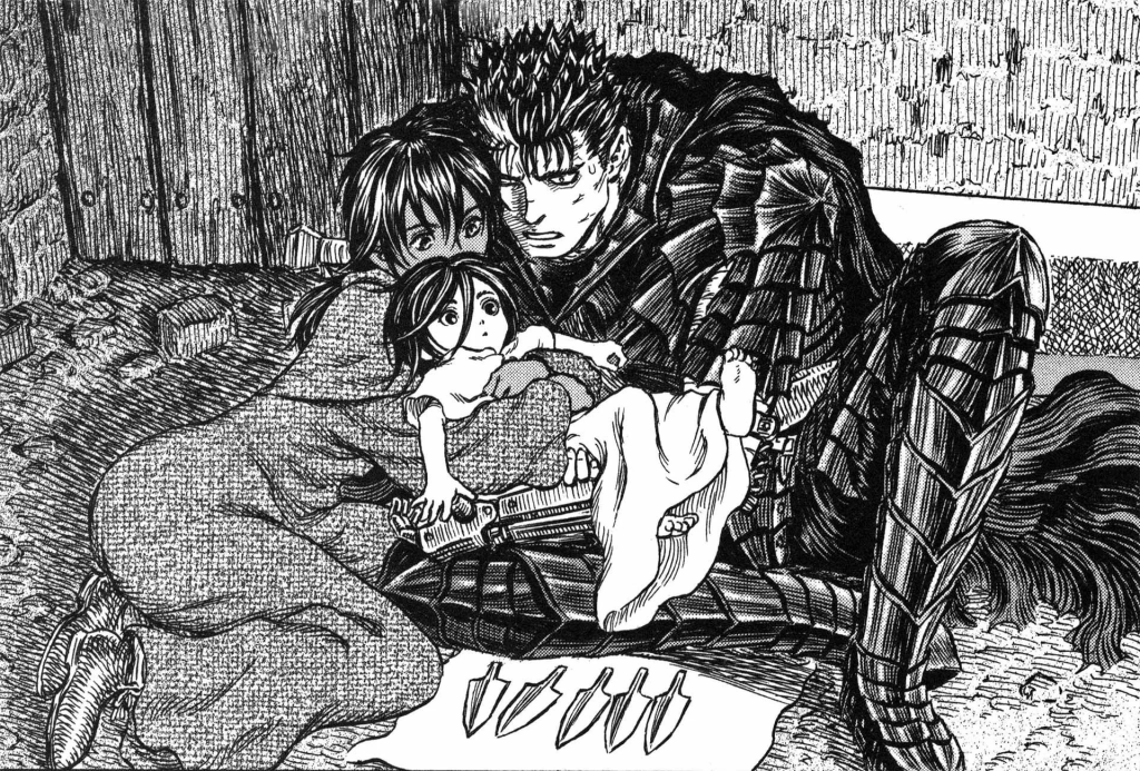 A lot of this and the message driving Guts from where he was to where he is now really left an imprint on me. Guts decided for himself that tragedy was part of life and that “struggling” was the best way forward. Early on after the Golden Age arc, this remained true, but Guts was forced to shift his thinking to survive, and so did the reader. He soon found himself protecting an empty Casca and started gaining companions on his journey to help him carry his load, relying on them to make himself better.