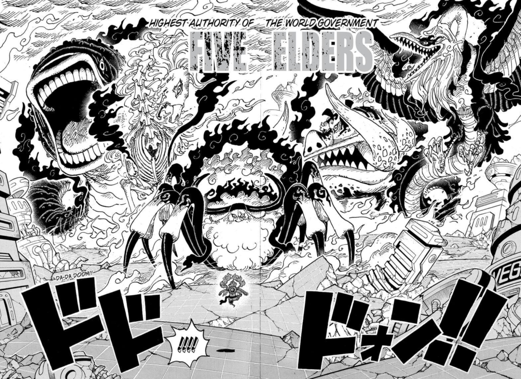 Being the first double page spread manga panel since the Son’s cup ceremony with Luffy and the Grand Fleet at Dressrosa, the reveal of the Gorosei’s “forms” (I need to know their devil fruit names!!!) is something that should be incredible in the anime.